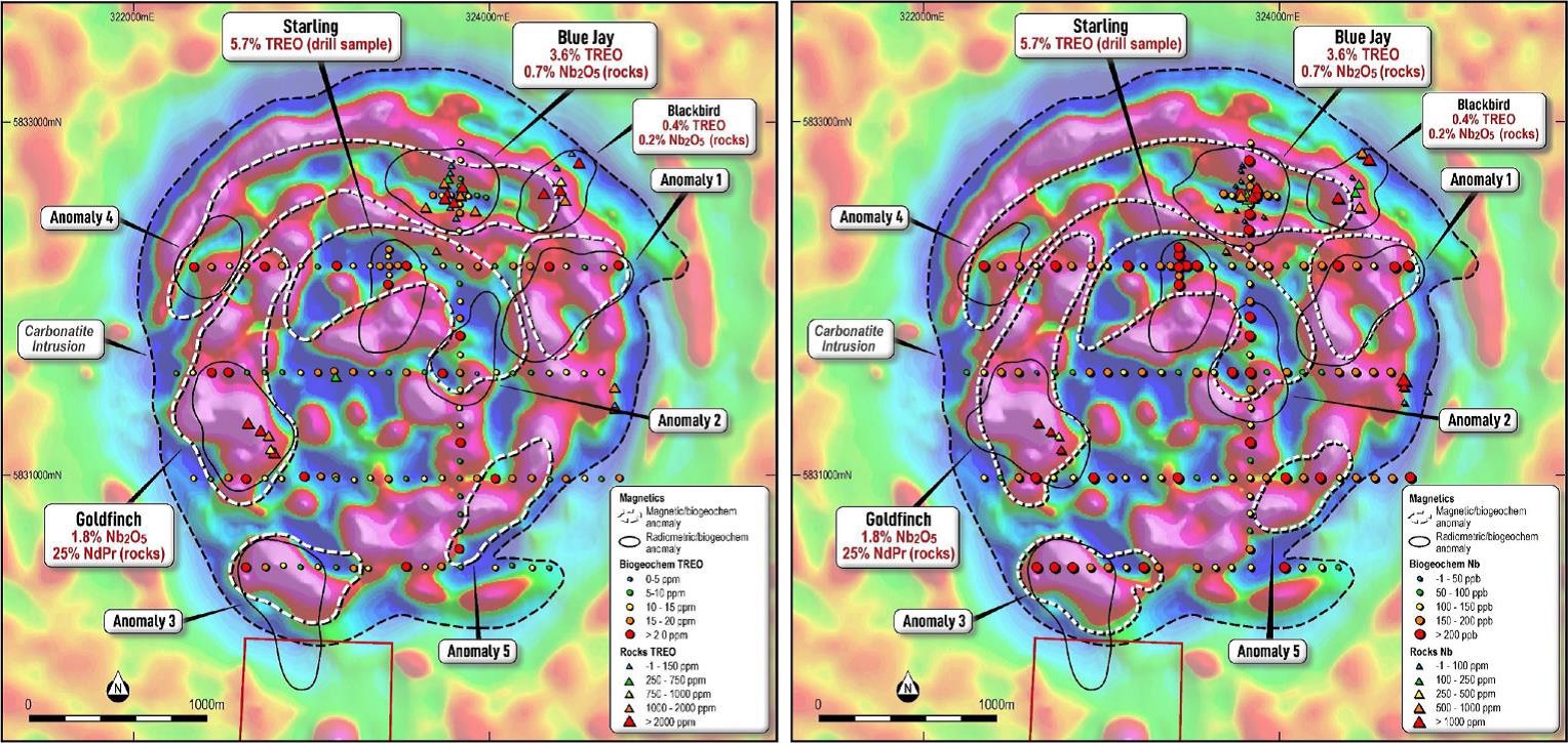 Figure 3: Thorium radiometric image with TREE biogeochemical results (left) and niobium biogeochemical results (right)