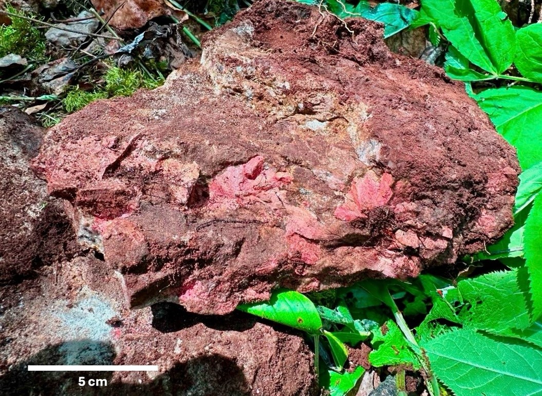 Figure 4: 2023 sample K042532 from the Blue Jay target area - intergrown ancylite-(Ce) and carbocernaite on a weathered outcrop surface; SEM-XRD confirmed; returned 3.588% TREO and 0.471% Nb₂O₅