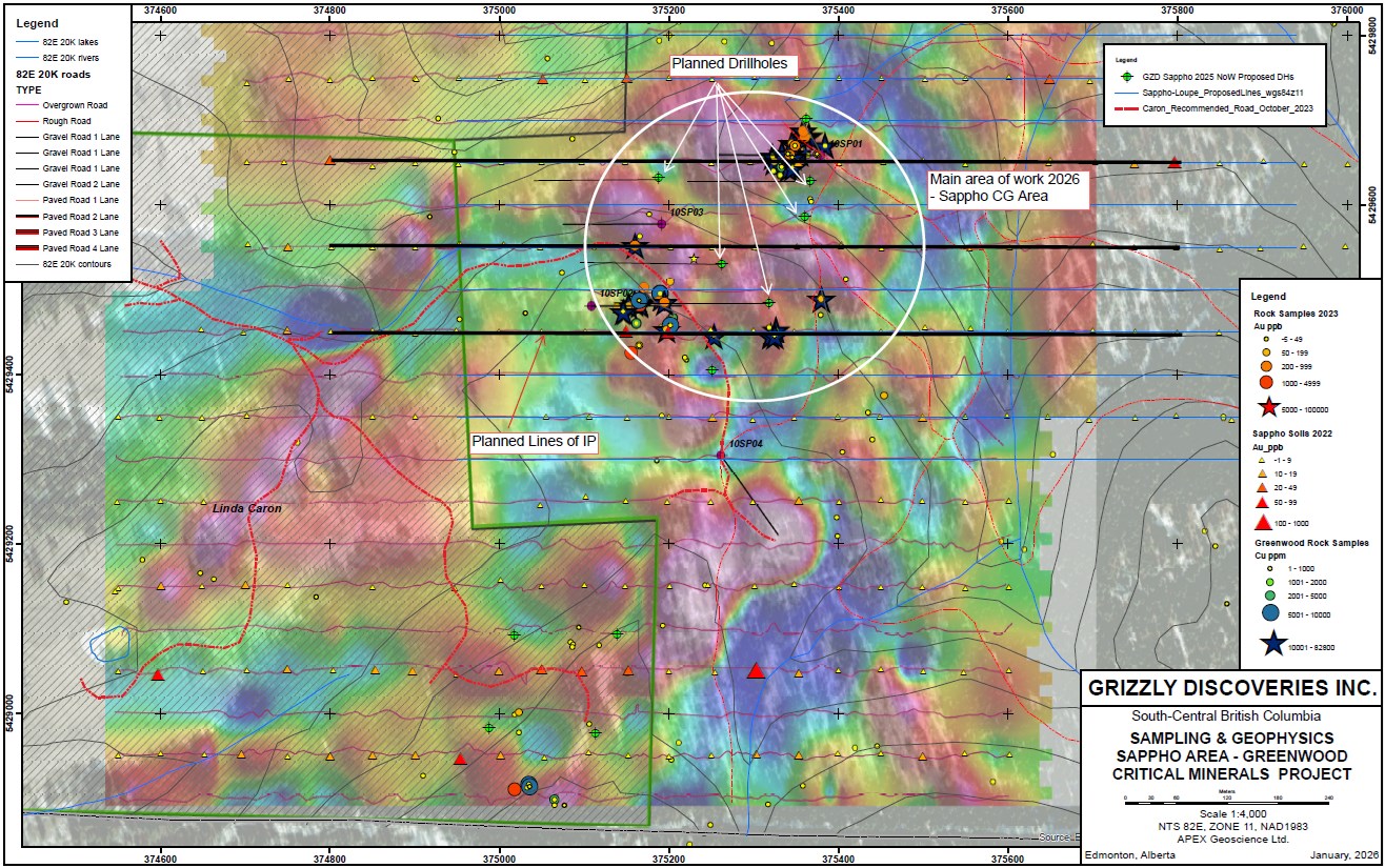 Edmonton, Alberta--(Newsfile Corp. - April 28, 2026) - Grizzly Discoveries Inc. (TSXV: GZD) (FSE: G6H) (OTCQB: GZDIF) ("Grizzly" or the "Company") is pleased to announce that a crew from Full Force Drilling Ltd. ("Full Force") of Peachland BC, has arrived in Greenwood and has commenced drilling critical minerals skarn targets co-incident with a high conductivity anomaly at the Sappho area. Grizzly intersected skarn along with porphyry type alteration and anomalous copper- silver - gold - platinum group elements (Cu-Ag-Au-PGEs) in three of four 2010 core holes. Historical 2010 drilling by the Company yielded up to 0.31% Cu, 0.75 g/t Au, 0.34 g/t Pt, 0.39 g/t Pd and 6.57 g/t Ag over 6.5 m core length in skarn at Sappho (in hole 10SP03). These and other higher grade zones are associated with high Cu and are contained within wider anomalous intervals including a 63.5 m core length zone logged as a pyroxene - sulphide skarn with a grade approaching 0.7% copper equivalent derived from current metal prices for Cu, Au, Ag, Pt and Pd.