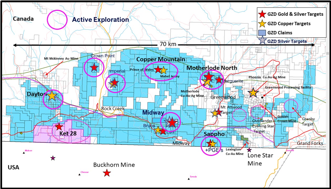 The Company is continuing with surface exploration in the Greenwood area. Crews from APEX Geoscience Ltd. completed soil and rock sampling in August, 2025 through to February, 2026 and the exploration work is ongoing. Work including prospecting, rock and soil sampling has been conducted at targets in the Rock Creek area, the Midway area, the Copper Mountain area, the Overlander-Attwood area and the Sappho area to date (Figure 2). Additional groundwork including ground geophysical surveys are being planned and will comprise IP, magnetics and Loupe electromagnetics (EM) for the Sappho, the Midway and Motherlode areas (Figure 2).