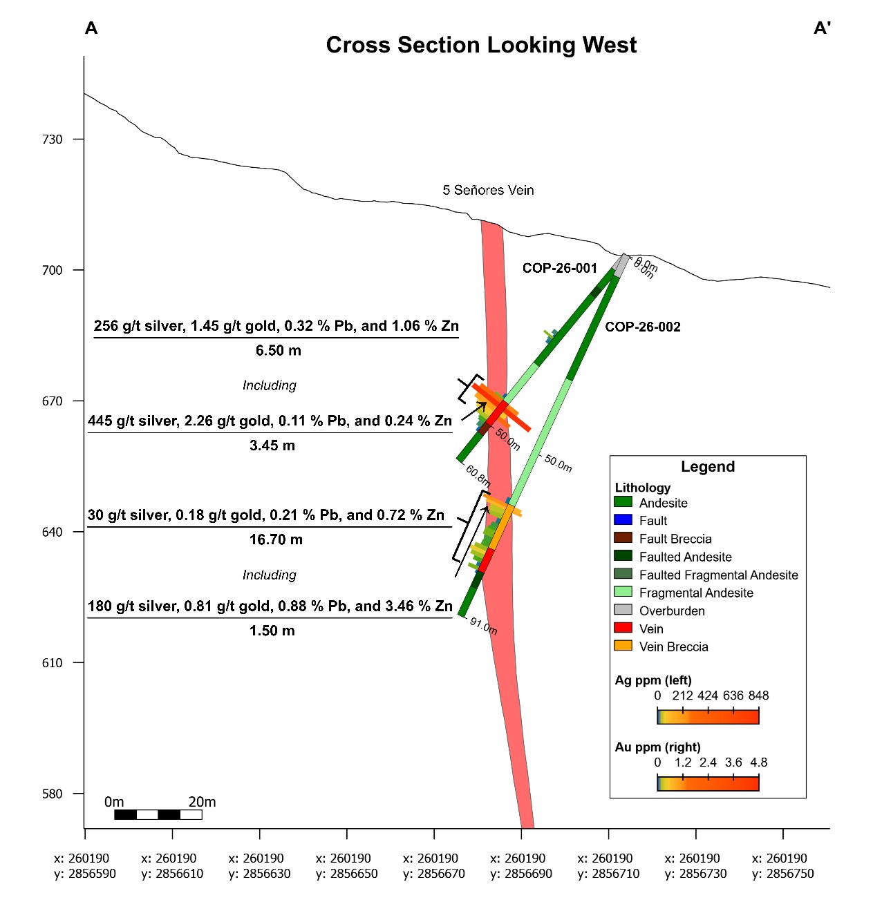 Drill holes COP-26-001 and COP-26-002 were drilled from the same pad, approximately 25 m west and 25 m east of historical drill holes. The first hole intersected the vein approximately 40 m below surface, and the second hole intersected the vein approximately 25 m below hole COP-26-001. COP-26-001 intersected a robust quartz-carbonate vein with banded, colloform and crustiform epithermal textures returning 3.45 metres of 445 g/t silver, 2.26 g/t gold, 0.11% lead and 0.24% zinc from 43.60 metres down hole, within a broader interval of vein and vein breccia mineralization that returned 6.50 metres of 256 g/t silver, 1.45 g/t gold, 0.32% lead, and 1.06% zinc (Figures 2 and 3). COP-26-002 intersected a much broader interval of vein and faulted vein breccia mineralization, which returned 16.70 metres of 30 g/t silver, 0.18 g/t gold, 0.21% lead and 0.72% zinc from 63.20 metres depth, anchored by a 1.50 m wide zone of vein mineralization that graded 180 g/t silver, 0.81 g/t gold, 0.88% lead and 3.46% zinc (Figure 2).