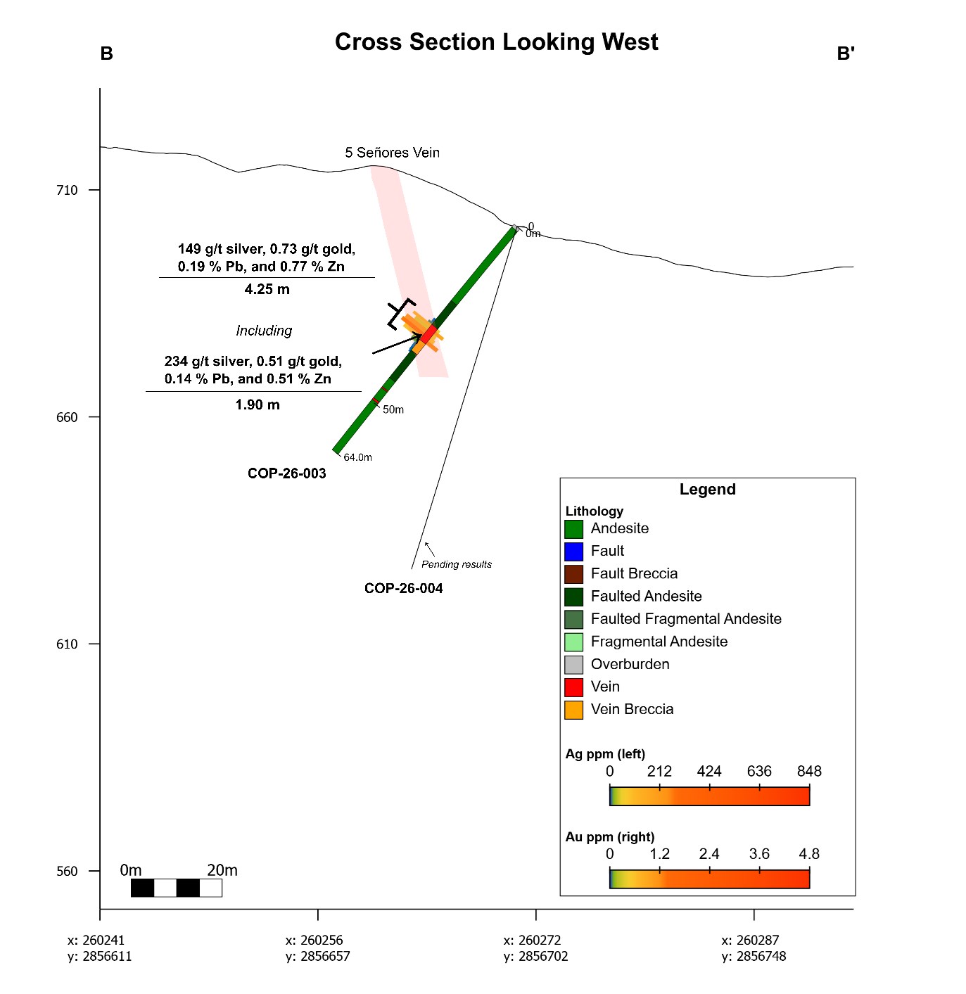 Drill hole COP-26-003 was collared approximately 42 m along strike between historic drill holes. The hole intersected the 5 Señores Vein approximately 35 m below the surface, returning 4.25 metres of 149 g/t silver, 0.73 g/t gold, 0.19% lead and 0.77% zinc from 28.55 metres down hole, including 1.90 metres of 234 g/t silver, 0.51 g/t gold, 0.14% lead and 0.51% zinc (Figure 4).