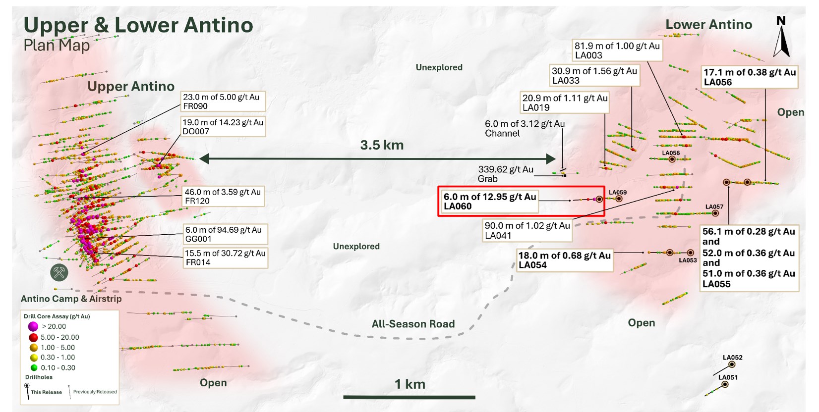 Colin Padget, President & CEO, commented, "The 6.0 metres of 12.95 g/t gold in LA060 is an important result for Lower Antino. While the system has consistently delivered broad, lower-grade mineralization, this intercept suggests the presence of a higher-grade component - a characteristic we have been actively testing for. Additional drilling in this release continues to grow the mineralized extent of Lower Antino, and we will incorporate these results into our geological models to better define the geometry and continuity of mineralization as the program advances."