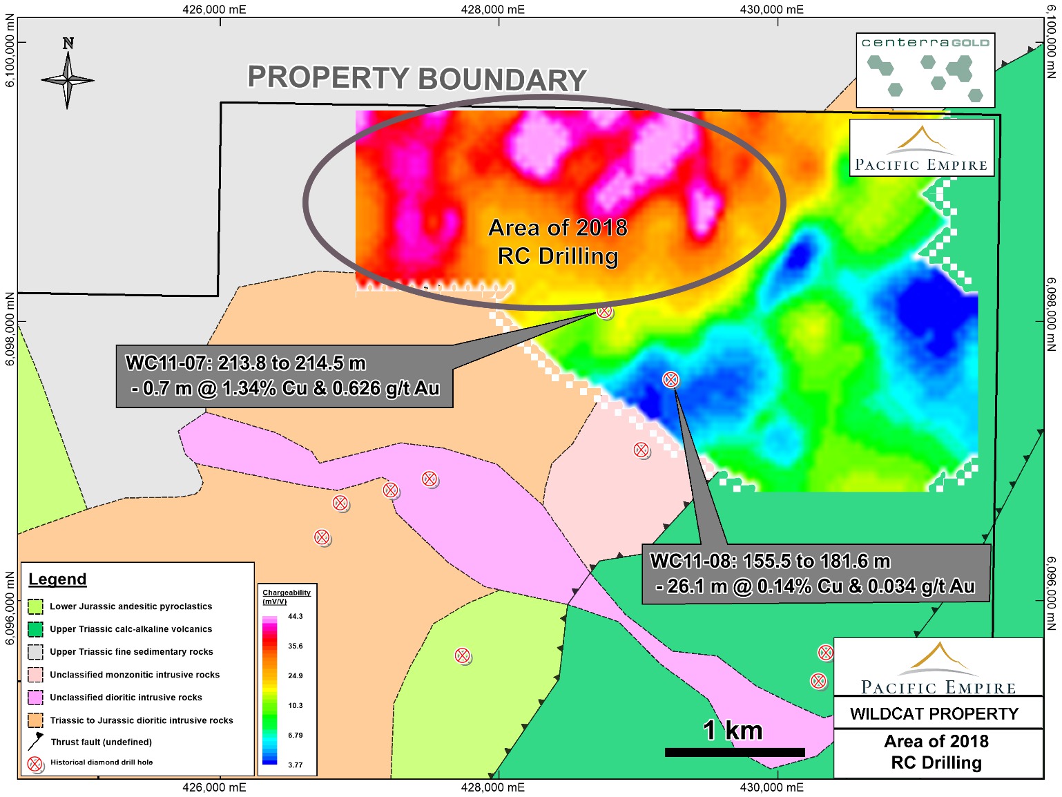 An initial 10 hole reverse circulation drilling program is now underway with the objective of testing a roughly 3.5 x 1.5 kilometre area of anomalous chargeability identified by PEMC during the spring of 2017. The target area is immediately to the north of historical drilling completed by Cayden Resources in 2011 that encountered hydrothermal alteration assemblages typical of those found distal to copper +/- gold porphyry systems.
