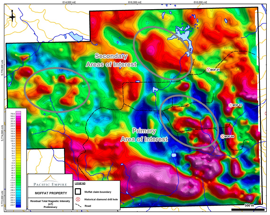 Pacific Empire’s President & CEO Brad Peters stated: “Using a “stinger” that is directly attached to the helicopter versus a “towed array” that hangs beneath the helicopter allows the helicopter to fly at greater speeds resulting in reduced survey times and associated costs. Initial results from the airborne survey show a number of areas of interest based on the presence of roughly ovate magnetic signatures on the property.”