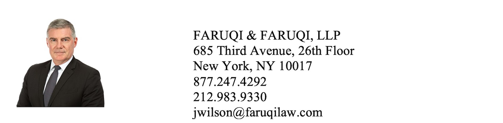 You can also contact Faruqi & Faruqi partner James Wilson toll free at 877-247-4292 or 212-983-9330 or by emailing him at jwilson@faruqilaw.com.