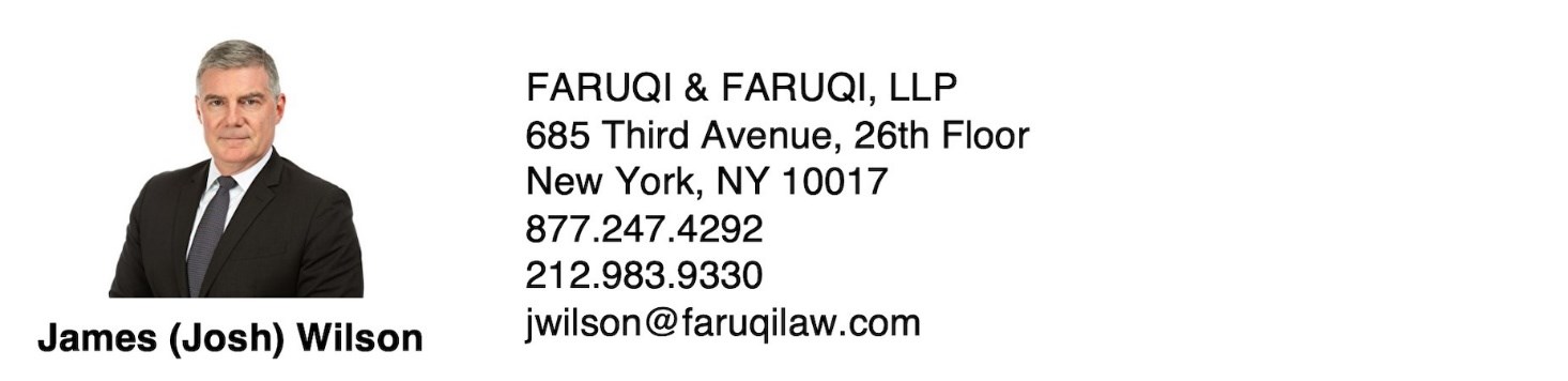 You can also contact Faruqi & Faruqi partner James Wilson toll free at 877-247-4292 or 212-983- 9330 (Ext. 1310) or by emailing him at jwilson@faruqilaw.com to discuss your rights and options.